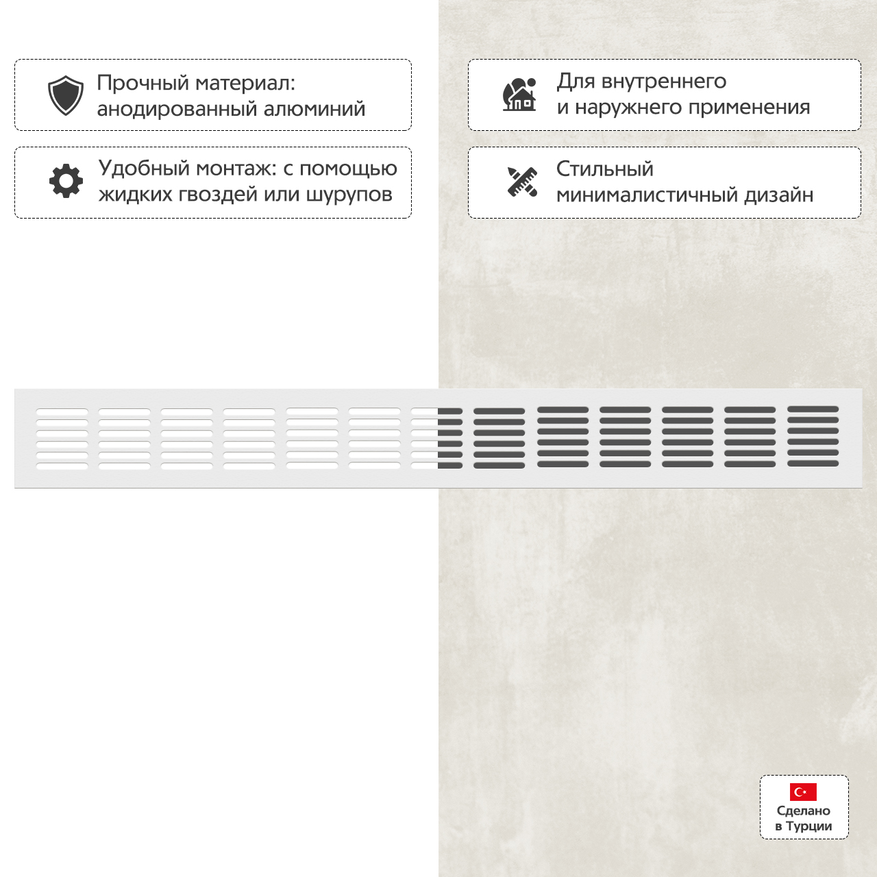 Идеально при монтаже в подоконники для правильного распределения воздуха от центрального отопления, обшивки радиаторов, дверей, мебели.