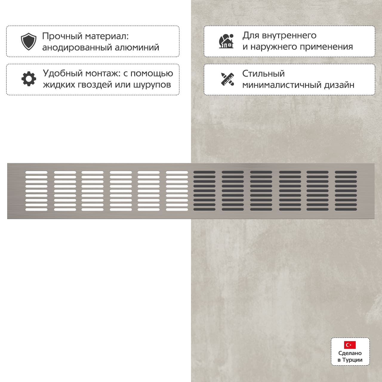 Прямоугольная вентиляционная решетка изготовлена из анодированного алюминия.