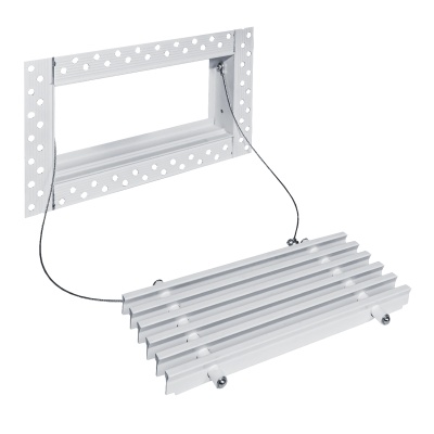 Данная решетка подходит для монтажа на любую поверхность под финишную отделку. Рама оснащена «полкой» 1,9 мм и рифлеными краями для большей адгезии финишного материала – шпатлевки, цемента. Решетка имеет съемную центральную часть с декоративным экраном. Она крепится к корпусу прочными металлическими тросиками, легко снимается для очистки и удобного обслуживания.
